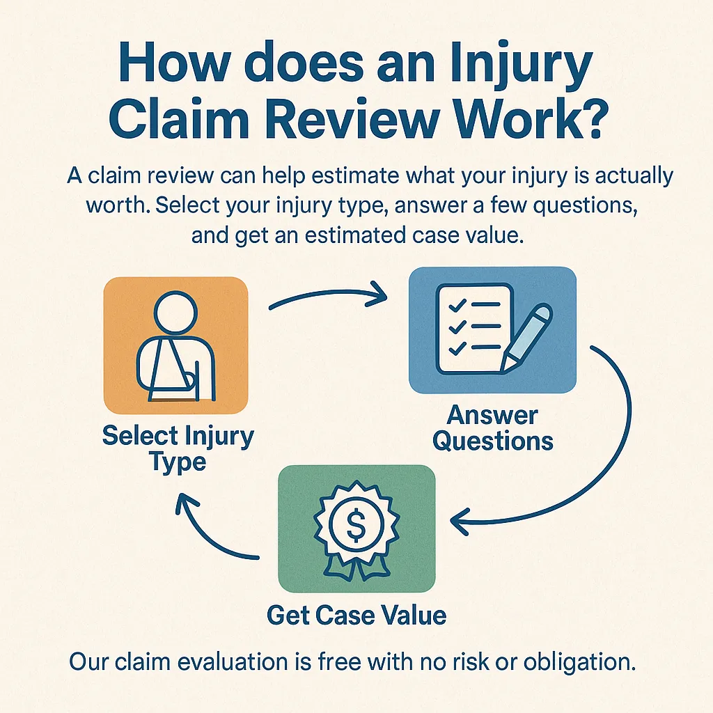 A claim review can help estimate what your injury is actually worth. Select your injury type, answer a few questions, and get an estimated case value.